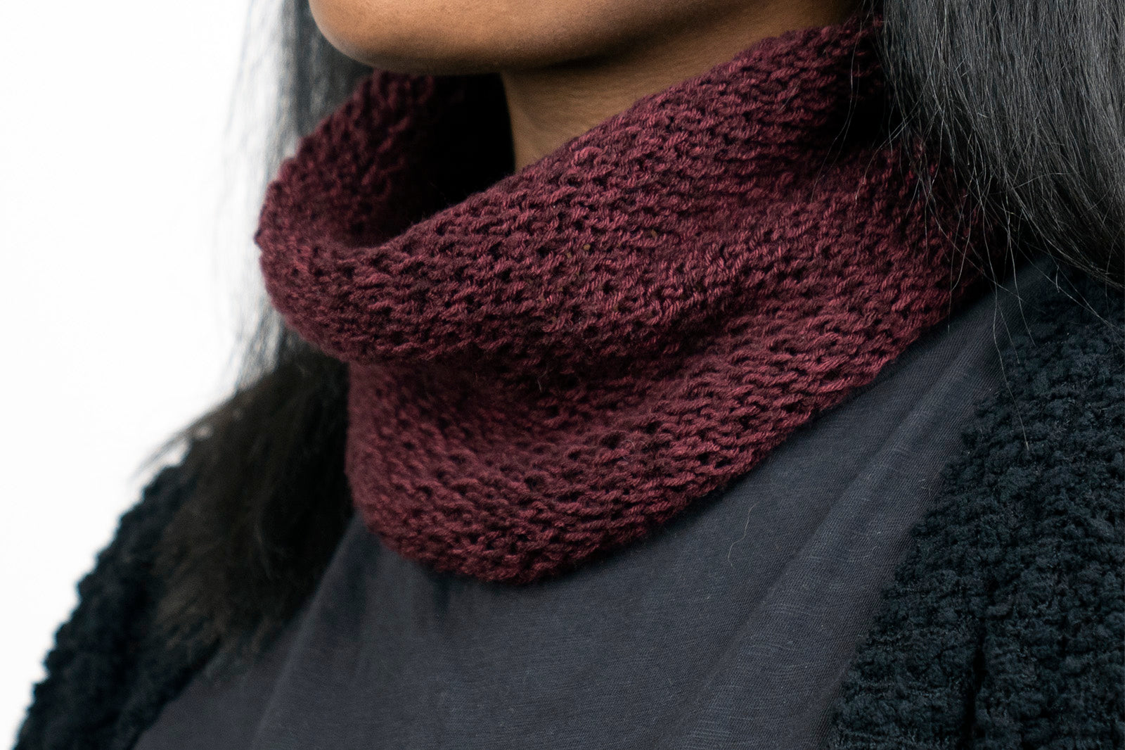 This short cowl scarf is hand-knitted in a rich oxblood color using a soft, low-pill acrylic yarn. Its compact, slip-on shape sits comfortably around the neck without bulk, making it well suited for layering with coats and sweaters.